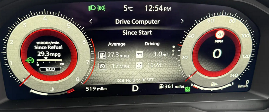 yesterday's trip was really brief. It appears that I am presented with three consumption statistics; nonetheless, it is encouraging to note that one of them has made a small inroad into the "thirties" range! These contradictory numbers continue to disappoint me, and I still don't understand why they're there. However, I've only covered 500 miles so far, so I'm hoping things will get better from here. By the way, I discovered a YouTube video that demonstrated how to eliminate those annoying speed limit "bongs"—a feature that really enhances the driving experience.