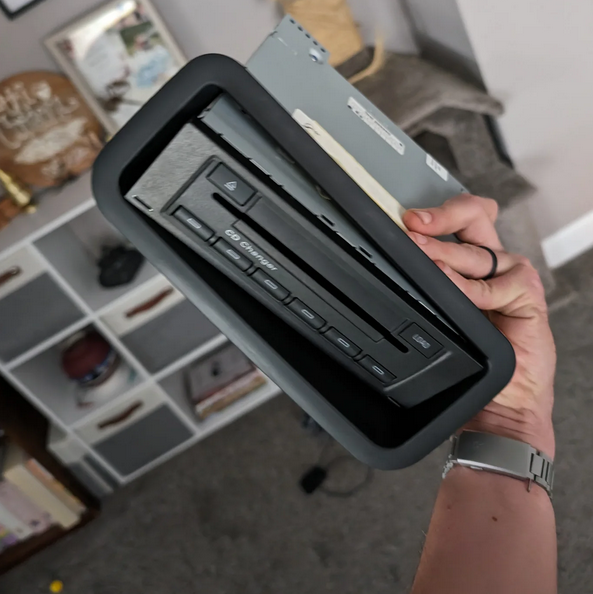 Similar to many others, I found the CD player in my Gen 1 to be somewhat ineffective, particularly after I had swapped the original stereo/head-unit with a Maestro Carplay unit from a third-party manufacturer. Lately, the weather in Indiana has been rather chilly, allowing me the opportunity to retrieve my CD player and contemplate strategies for integrating a phone holder and charger into my car's interior. I began the task by removing the CD player and the rear parcel shelf: Upon careful examination of the plastic trim ring, I determined that I had the capability to create a three-dimensional digital model and then produce a replacement using a three-dimensional printer. This replacement would effectively occupy the space formerly occupied by the CD player. I acquired an ultra-slim wireless charger that operates via a USB C cable. I strategically positioned the cable through the centre console and connected it to the ashtray cigarette lighter using a right-angle USB C adaptor, ensuring enough space for the ashtray lid to be securely closed. Initial trim component: The first iteration of Fusion 360 has a cavity designed to accommodate a wireless charger, as well as a platform to securely hold a phone against it. Below is the visual representation of the component when it was printed: Upon conducting a test fit, I discovered that the back portion of the plate, which gradually narrows down to a square surface intended to rest against a CD player that is no longer there, does not need such intricate design. After making a few modifications, we have arrived at the final component, which now has a much simplified rear section that can be easily connected to the parcel shelf. (Due to reaching the maximum capacity for attachments, please go to the subsequent post below for more photographs.)
