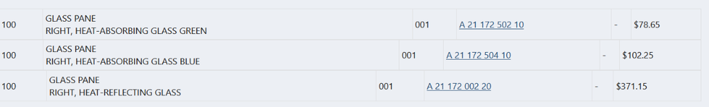 As per the ECP, you may choose from three options for the driver's door window glass: a green one, a blue one, and a reflective one, which corresponds to the first Part# you provided. The same part numbers are shown for a comparable E220/320CDi estate, indicating that the glass from that model will likewise be compatible. This particular one, which has a blue hue, is suitable. This one https://www.ebay.co.uk/itm/176176260376?fits=Car+Make:Mercedes-Benz|Plat_Gen:S211&epid=1916123421&itmmeta=01HV77TG9VDCW3P425ERYGFMSW&hash=item2904ec6518:g:xDoAAOSwHMtloZvV&itmprp=enc:AQAJAAAA8N3NqISuCMTsHNdhWpeF2OGhnGskaBXhG4X0Co7t9RZxR3IIFAFnMIphXfNEMBu6Wge4Ba5Nau+Nr4VNGVUFTKFNgjyl4s7HZH4htgICTu3GVYoZ8feoDwACBIWDeJctsZgajXLeoA/Z6c5jPcwkKA9SST5a2D5DbaOx9EI+S4CAWvsSARrJd1GQmm4oCnCNAnzOUVDSihWJgBslvyAS2lhf54Q4S8vv9Nhv/M8EvgTSlTQjfz+EZyP4k/fw9EeGvFh+2XAJ2LRo7cyvd7833vgIhfubxb3WiVeoED2TsGzS3mjne1+I+958Qhm6zxReeA==|tkp:BFBMhIXq59lj&mkevt=1&mkcid=1&mkrid=710-53481-19255-0&campid=5338181125&toolid=10001&customid=2518X1570512Xe0c270c88f3ea3d1a49f93a165fbd7a5 https://www.ebay.co.uk/itm/166606660985?fits=Car+Make:Mercedes-Benz|Plat_Gen:S211&itmmeta=01HV77TG9VK4B3NE8VTQ2A0BZE&hash=item26ca87e579:g:YZIAAOSwdVpl0722&itmprp=enc:AQAJAAAA4Ovr+3TWFK6Gh/rxAy79m+EeiiGJFX/WTmANwBwydfeXkmRquHmY4x7pGhOq1NKWX5RxSs8m91vQVH1IMWZ5hikI8qta39KyOGACIY7csOUBbRTcgaTGBBql9j7A15D80Tjx1X4lWrq7/YXPwpKtSm9uamVRKhD+zDQxR5/u3Rf4PmTL4av5rPojErlzSSfRS44qjr5pp+lMQRghgRfYhMn3URqkoCVir1KJ3TQbD/YptPZKxyTiB36DCXTuGMP4+qu9+DGXNrnSi8/IbRpFypiRFTZXnBM1e8TFwmqWGsG7|tkp:Bk9SR4aF6ufZYw&mkevt=1&mkcid=1&mkrid=710-53481-19255-0&campid=5338181125&toolid=10001&customid=2518X1570512Xabc00d55a1317ab731ad0fbca0b45df6