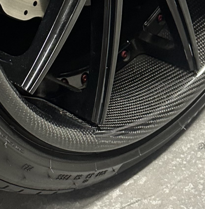 The carbon lip is the only part that is bonded or laminated. The quality of the carbon work is subpar in my view. The picture shows the link between carbon and wave. It is allowed to wrap the edges of rims if done appropriately, ideally using specialised adhesives instead of resin. A substantial quantity of carbon fibre material is needed to correctly wave or lay it, leading to a notable amount of waste. The roll must be turned when bonding. The whole procedure must be meticulously drawn out and sanded flawlessly to prevent any complications with wheel balance.
