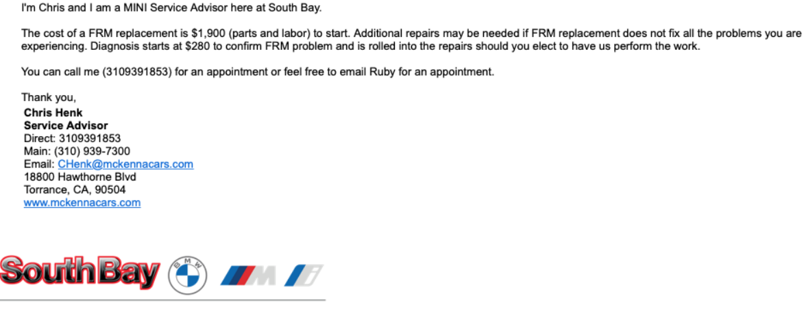 I inquired about the price of replacing the FRM at South Bay BMW. Painful!